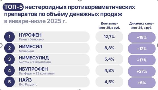 В январе — июле в российском ретейле было представлено порядка 165 торговых марок НПВП от 136 компаний. Лидерство в группе продолжает удерживать бренд «Нурофен» компании «Рекитт Бенкизер» с 12,7% суммарного объема продаж. За 7 месяцев россияне потратили на покупку «Нурофена» почти 6,8 млрд рублей, на 18% больше, чем за тот же период 2024-го. На втором месте по-прежнему «Нимесил» от «Менарини» с 8,8% (рост продаж в рублях 12%). Замыкает первую тройку небрендированный препарат «Нимесулид» — в отчетный период выпускали 19 компаний, марка обеспечивала 5,4% стоимостных продаж (+17%). Далее расположился еще один небрендированный препарат «Ибупрофен» с 4,8% (+27%) и «Найз» от «Д-р Редди′с» с 4,5% (+6%).