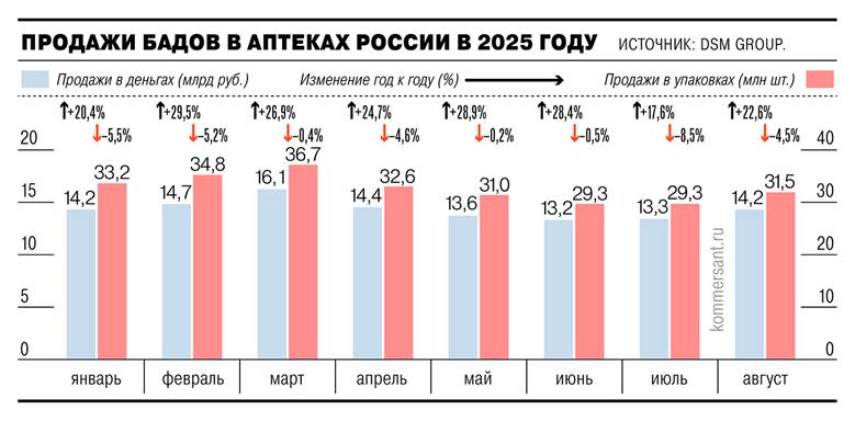 Продажи БАДов в России растут в денежном выражении, но стагнируют в натуральном. По данным DSM Group, в августе 2025 года объем реализации БАДов в аптеках вырос на 22% год к году в деньгах (14,2 млрд руб.). Одним из драйверов дальнейшего роста этого сегмента может стать вступивший в силу с 1 сентября 2025 года закон о праве врачей назначать пациентам биодобавки.